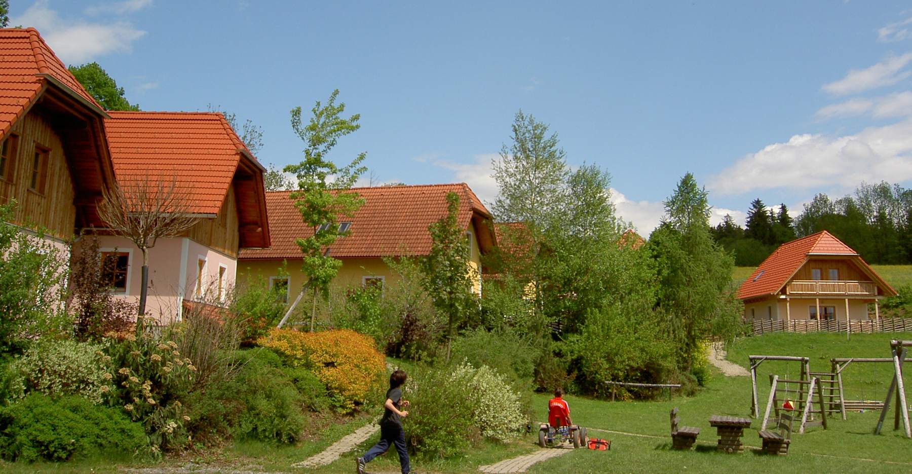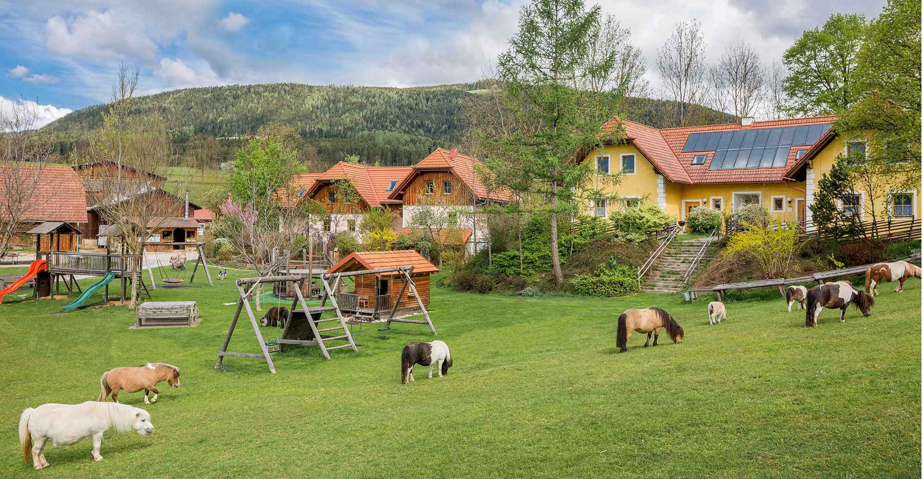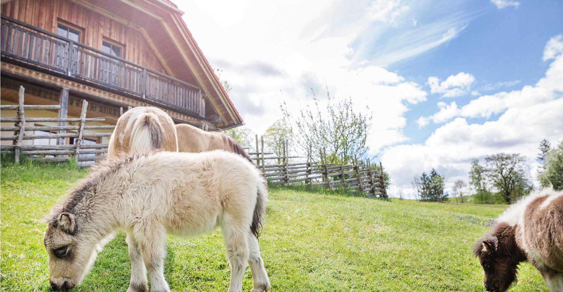 Wir vermieten Ferienhäuser, Appartements, Apartement am Miniponyhof mit viel Erlebnisprogramm wie Ponyreiten oder Ponywandern, Pferde und Stallarbeit für die Kinder. Einige Biohäuser sind mit Holz aus dem eigenen Wald errichtet, auch die Möbel sind ausschließlich aus Vollholz. Somit war uns beim Bau der Rohstoff Holz sehr wichtig. Jedes Ferienhaus verfügt über eine eigene Terrasse auf der die Kinder spielen und herumtollen können.