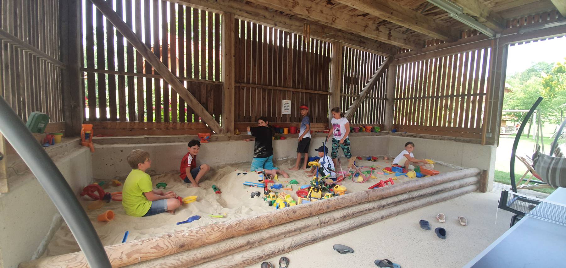 - Indoor Kinderspielbereich 100 m² mit Riesensandkiste, Tischtennis, Drehfußball, Tonnenpferd, Nagelstock usw.